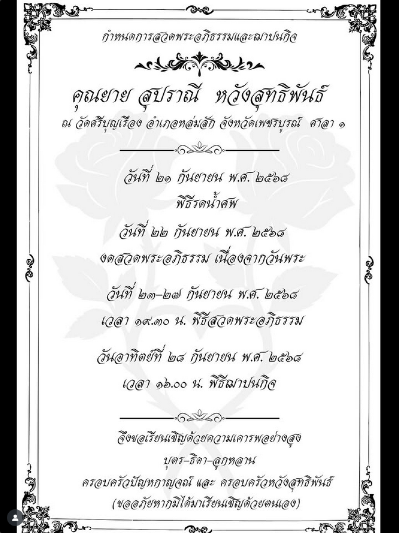 กำหนดการพิธีงานสวดอภิธรรมและฌาปนกิจ คุณยายสุปราณี หวังสุทธิพันธ์ เจ้าภาพใคร่ขอเรียนเชิญทุกท่านร่วมแสดงความอาลัยและร่วมน้อมส่งดวงวิญญาณ ขอความกรุณาทุกท่าน งดแชร์รูปภาพคุณยาย ลงในกลุ่ม และเพจสาธารณะต่างๆในโซเชียลมีเดีย ด้วยความเคารพต่อประสงค์ของคุณยายของเรา ขอขอบพระคุณทุกกำลังใจและความเข้าใจจากทุกท่านมา ณ ที่นี่ด้วย ด้วยความเคารพอย่างสูง
