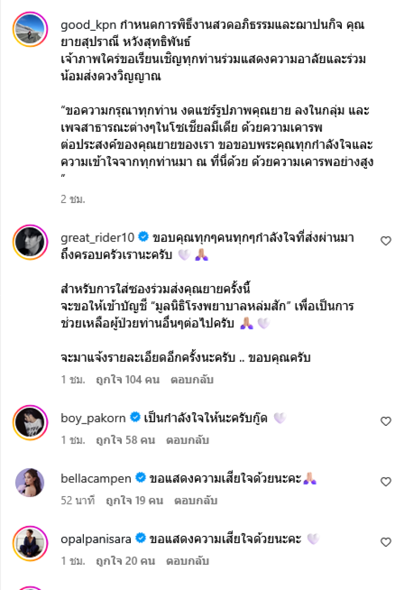 ขอความกรุณาทุกท่าน งดแชร์รูปภาพ แจ้งข่าวสาร ลงในกลุ่ม และเพจ ต่างๆในโซเชียลมีเดีย ด้วยความเคารพต่อประสงค์ของคุณยายของเรา และทางเจ้าภาพมีความเกรงใจแขกทุกท่าน ในช่วงเวลานี้ ขอขอบพระคุณทุกกำลังใจและความเข้าใจจากทุกท่านมา ณ ที่นี่ด้วย ด้วยความเคารพอย่างสูง