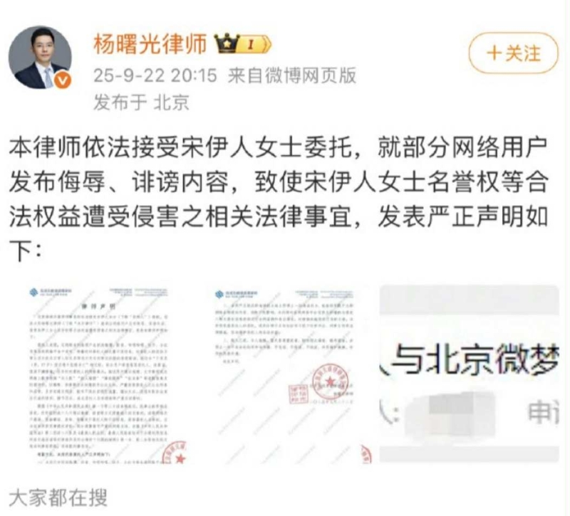 จากกรณีการเสียชีวิตของอวี๋เหมิงหลง กลายเป็นจุดเปลี่ยนสำคัญของนักแสดงหญิงชื่อดัง ซ่งอีเหริน วันที่ 22 กันยายน เธอ ได้เดินหน้าต่อสู้ทางกฎหมายอย่างจริงจัง ด้วยการมอบหมายให้หยางสู่กวง ทนายมากประสบการณ์ ออกแถลงการณ์บนเวยปั๋ว เพื่อยืนยันการดำเนินคดีต่อผู้ที่เผยแพร่ข้อมูลเท็จ และทำให้ชื่อเสียงของ เธอ เสียหาย