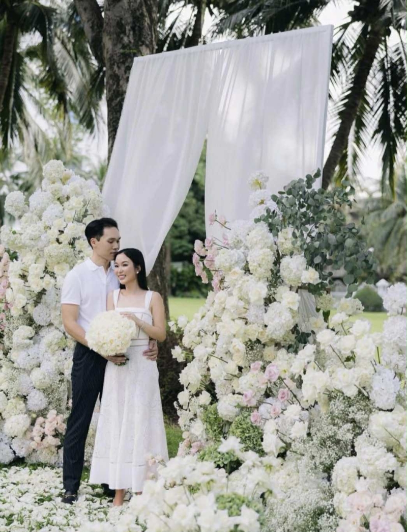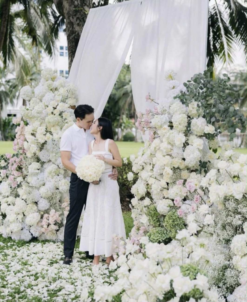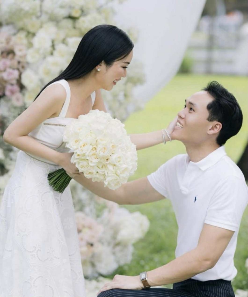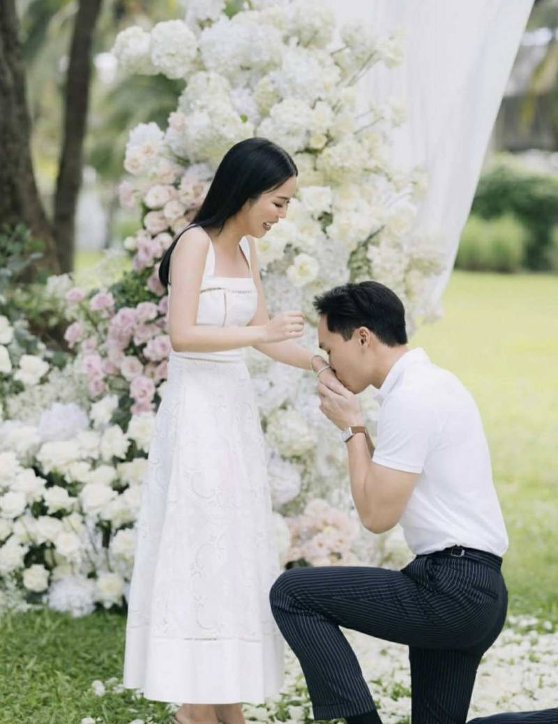 โดย พิธีจัดขึ้นอย่างเป็นกันเองในสวนสวย ที่ถูกตกแต่งอย่างประณีตด้วยดอกไม้โทนหวาน สะท้อนถึงความละมุน และความหมายพิเศษของช่วงเวลา ก่อนที่ฝ่ายชาย จะคุกเข่ามอบแหวนหมั้น และช่อดอกไม้สีขาวให้เป็นสัญลักษณ์แห่งความรักนิรันดร์