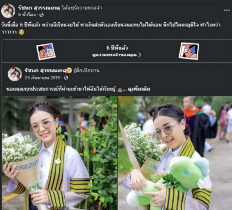 ล่าสุด เจ้าตัว ได้แชร์ภาพความทรงจำเมื่อ 6 ปีก่อน ตอนเพิ่งสำเร็จการศึกษาระดับปริญญาตรี ผ่านเฟซบุ๊ก รัชนก สุวรรณเกตุ โดย มีข้อความสะท้อนความภูมิใจว่า กว่าจะเรียนจบได้ต้องทำงานหนัก ส่งเสียตัวเองจนแทบไม่ได้นอน แต่ความพยายามก็ทำให้ฝันเป็นจริง