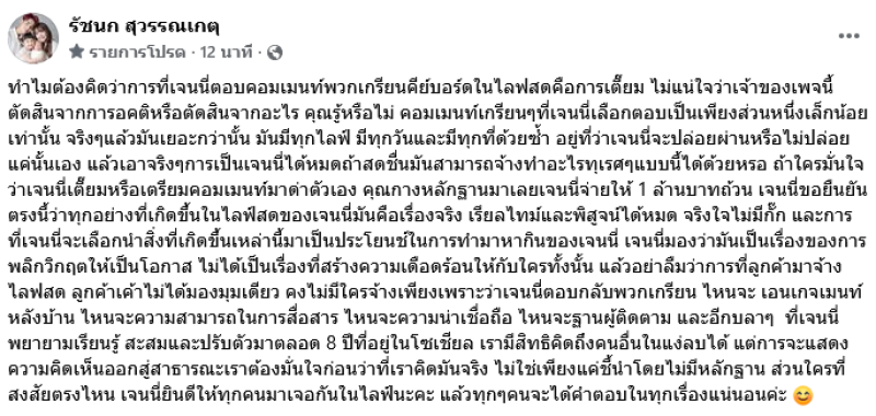 ล่าสุด เจนนี่ รัชนก ได้ออกมาแชร์โพสต์ดังกล่าวพร้อมเผยว่า ทำไมต้องคิดว่าการที่เจนนี่ตอบคอมเมนท์พวกเกรียนคีย์บอร์ดในไลฟสดคือการเตี๊ยม ไม่แน่ใจว่าเจ้าของเพจนี้ตัดสินจากการอคติหรือตัดสินจากอะไร คุณรู้หรือไม่ คอมเมนท์เกรียนๆที่เจนนี่เลือกตอบเป็นเพียงส่วนหนึ่งเล็กน้อยเท่านั้น จริงๆแล้วมันเยอะกว่านั้น มันมีทุกไลฟ์ มีทุกวันและมีทุกที่ด้วยซ้ำ อยู่ที่ว่าเจนนี่จะปล่อยผ่านหรือไม่ปล่อยแค่นั้นเอง