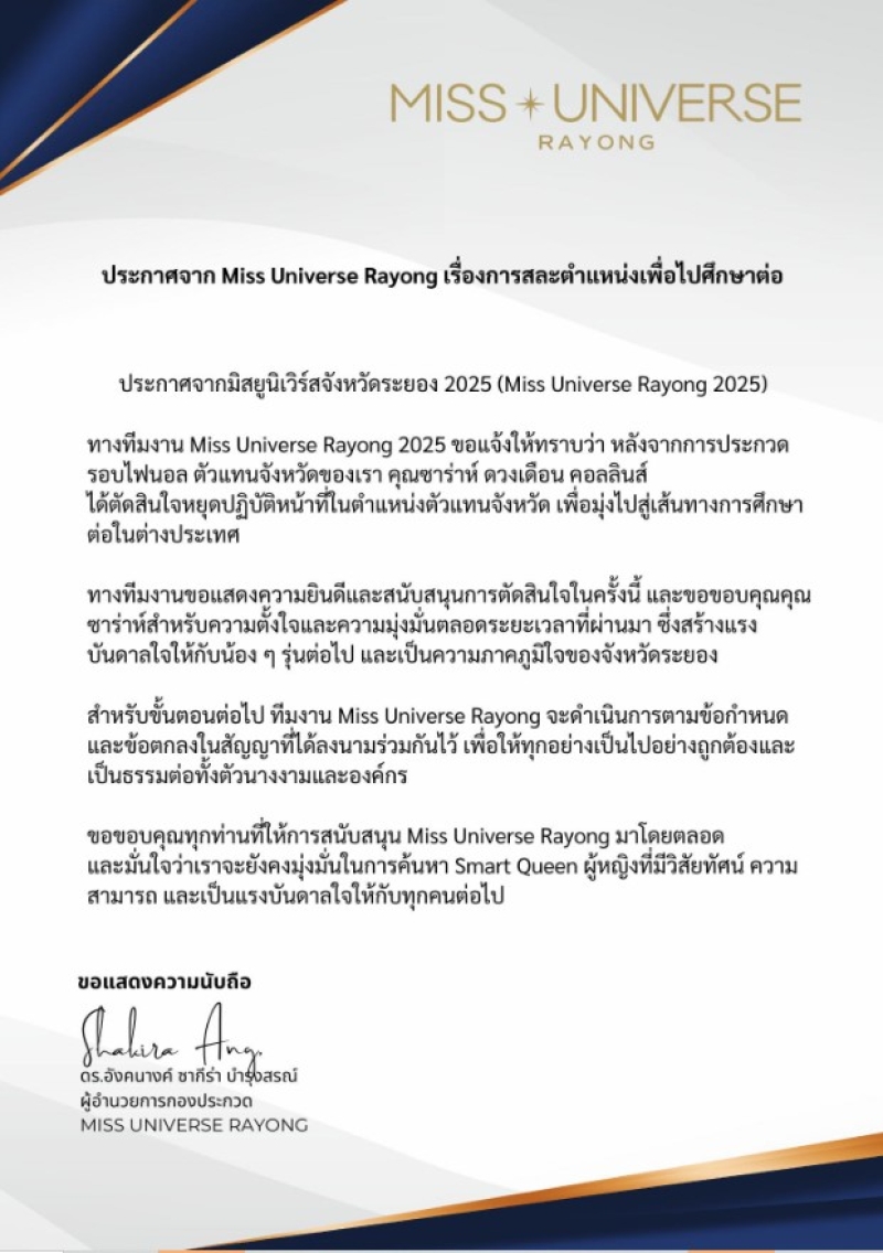 เรียกได้ว่า ทำเอาแฟนๆใจหาย เมื่อทางกองประกวดมิสยูนิเวิร์สระยอง - Miss Universe Rayong ได้ออกมาโพสต์ว่า “Miss Universe Rayong 2025 ขอแสดงความยินดีกับ คุณซาร่าห์ ดวงเดือน คอลลินส์ ที่ตัดสินใจสละตำแหน่งเพื่อไปศึกษาต่อในต่างประเทศ