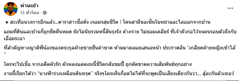 ทำเอาวงการบันเทิงสั่นสะเทือนเมื่อทางด้านเพจดังอย่างท่านเปา ได้ออกมาโพสต์ข้อความถึงดาราสาวคนดังว่า เจอมรสุมชีวิต โดนสามีขอเซ็นใบหย่าและไล่ออกจากบ้าน แถมที่ดินและบ้านก็ถูกยึดคืนหมด ยังไม่นับรวมหนี้สินรุงรัง ค้างจ่าย ไม่ยอมเคลียร์ ที่เจ้าตัวก่อไว้จนคนรอบตัวถึงกับเอือมระอา