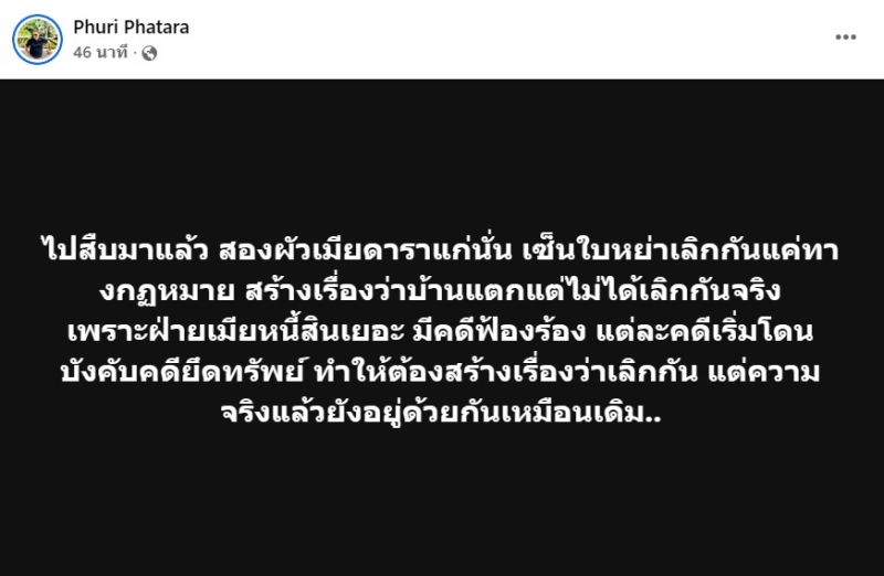 ล่าสุดมีวงใน เมื่อPhuri Phatara ได้ออกมาเผยว่า ไปสืบมาแล้ว สองผัวเมียดาราแก่นั่น เซ็นใบหย่าเลิกกันแค่ทางกฏหมาย สร้างเรื่องว่าบ้านแตกแต่ไม่ได้เลิกกันจริง เพราะฝ่ายเมียหนี้สินเยอะ มีคดีฟ้องร้อง แต่ละคดีเริ่มโดนบังคับคดียึดทรัพย์ ทำให้ต้องสร้างเรื่องว่าเลิกกัน แต่ความจริงแล้วยังอยู่ด้วยกันเหมือนเดิม..