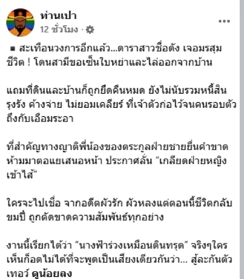 ต่อด้วย เพจ ท่านเปา ออกมาเผยข้อมูลชวนสะเทือนใจถึงชีวิตส่วนตัวของดาราสาวชื่อดังรายหนึ่ง ซึ่งกำลังเผชิญกับมรสุมครั้งใหญ่ เมื่อถูกสามีขอหย่า พร้อมขอให้ย้ายออกจากบ้านที่เคยอยู่ร่วมกัน โดยทรัพย์สินต่าง ๆ ทั้งบ้านและที่ดินที่เคยใช้ชีวิตร่วมกัน ถูกขอคืนทั้งหมด