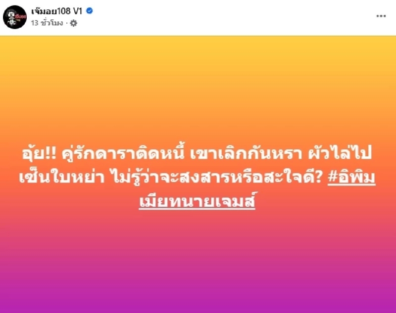 เพจดัง เจ๊มอย108 V1 แฉแซ่บอีกแล้ว หลังวันนี้วงการบันเทิงดูทรงแล้ว จะร้อนแบบไม่มีแผ่ว โดยระบุว่า อุ้ย!! คู่รักดาราติดหนี้ เขาเลิกกันหรา ผัวไล่ไปเซ็นใบหย่า ไม่รู้ว่าจะสงสารหรือสะใจดี? #อิพิมเมียทนายเจมส์