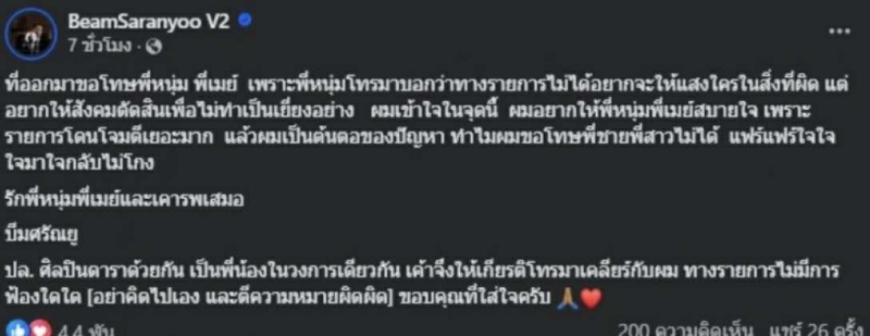 หลังการพูดคุย บีม จึงได้โพสต์ข้อความใหม่ ยืนยันว่า เข้าใจในเจตนาของรายการ พร้อมกล่าวขอโทษ และขอบคุณที่ให้เกียรติเคลียร์ใจกันตรงๆ ตนยังคงเคารพ และรักในฐานะพี่น้องร่วมวงการ