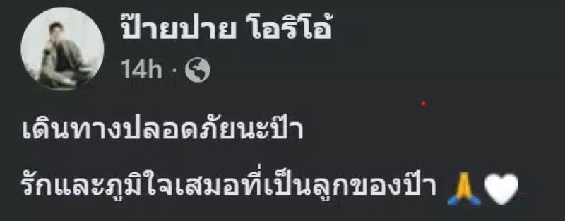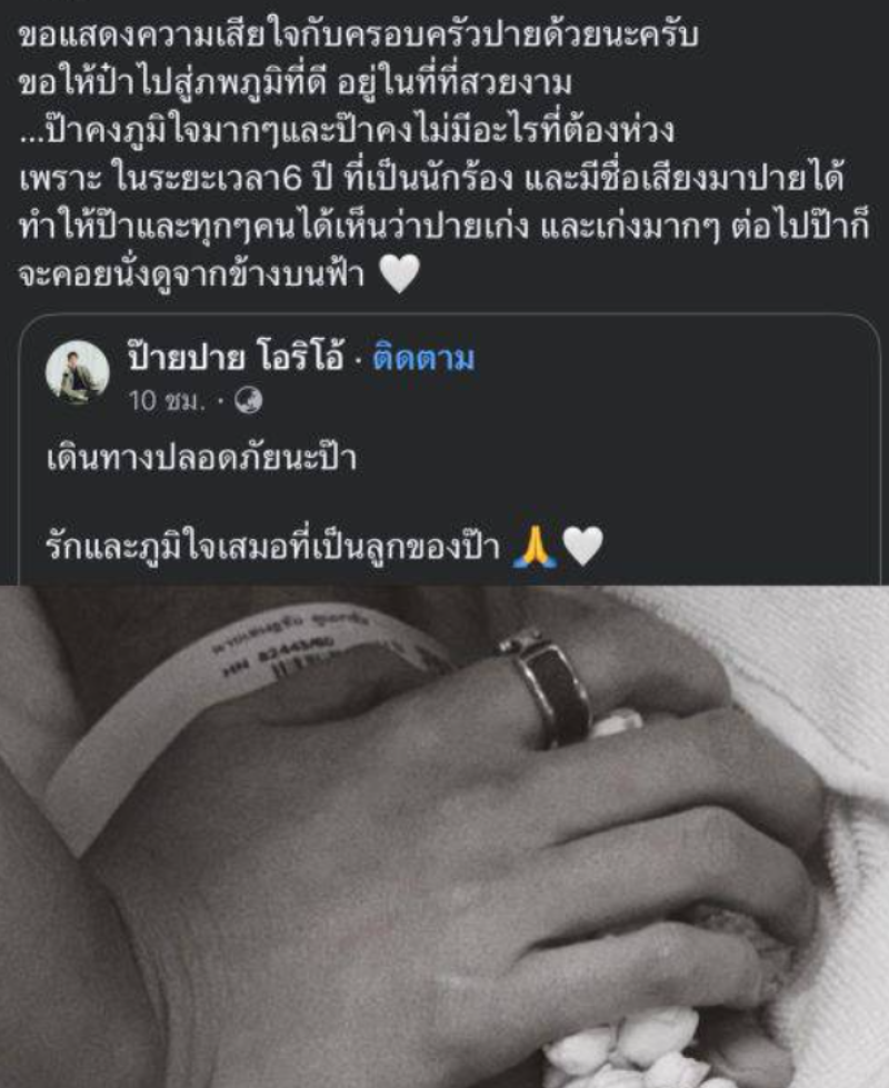 โดย ปาย ได้เขียนถ้อยคำสั้นๆ แต่กินใจว่า เดินทางปลอดภัยนะป๊า รักและภูมิใจเสมอที่ได้เป็นลูกป๊า พร้อมภาพจับมือกับคุณพ่อ ทำเอาแฟนเพลง และผู้ติดตามนับไม่ถ้วนต่างเข้ามาแสดงความอาลัย และส่งกำลังใจให้เธออย่างอบอุ่น