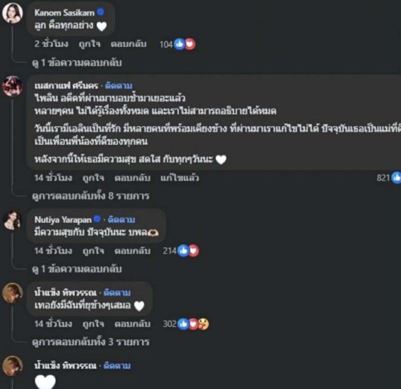 หลังจากโพสต์ถูกเผยแพร่ออกไป เหล่าคนดังในวงการ รวมถึงแฟนๆ ต่างเข้ามาให้กำลังใจอย่างล้นหลาม พร้อมชื่นชมในความเข้มแข็ง และมองว่าความรักที่มีต่อลูก คือ คำตอบที่สวยงามที่สุดแล้วสำหรับชีวิตของเธอ