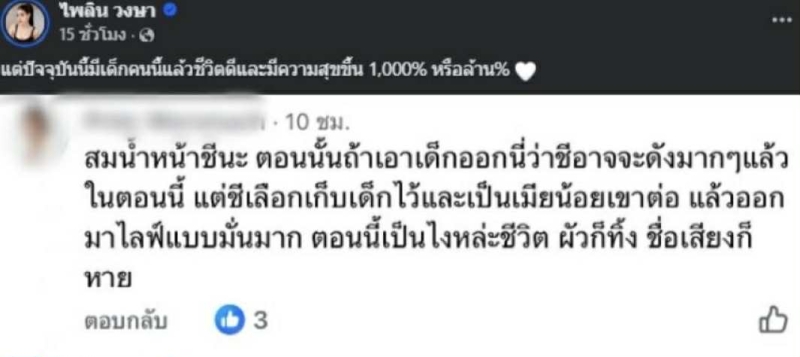 ท่ามกลางกระแสดราม่า แบม ไพลิน ออกมาเคลื่อนไหวด้วยการโพสต์ข้อความตอบโต้ ผ่านเฟซบุ๊ก ไพลิน วงษา เธอยืนยันชัดเจนว่า การมีลูกคือสิ่งที่ทำให้ชีวิตมีความหมาย พร้อมระบุว่าตอนนี้ เธอ มีความสุขมากกว่าเดิมหลายเท่า