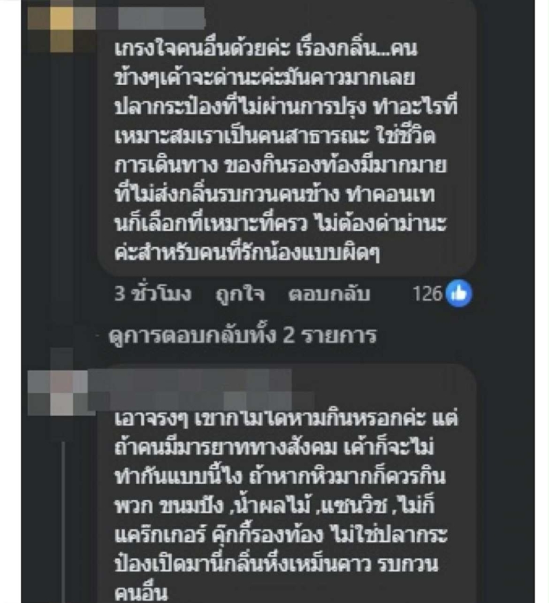 เสียงสะท้อนจากโซเชียลมีทั้งคอมเมนต์เชิงตำหนิ อาทิ มองว่าไม่เหมาะสมกับสถานที่สาธารณะ และควรเลือกอาหารที่ไม่ก่อให้เกิดกลิ่นแรง ขณะที่บางข้อความก็ถึงขั้นบอกว่า เป็นพฤติกรรมที่ขาดความเกรงใจต่อคนรอบข้าง