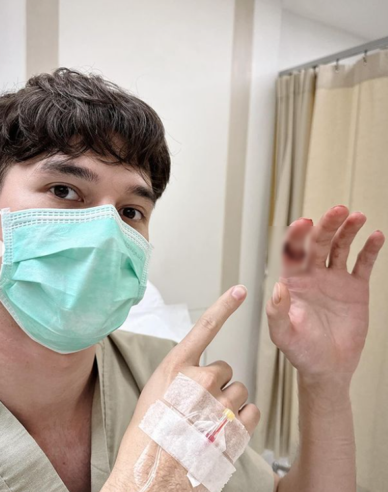 โดยได้โพสต์รูปลงบนอินสตาแกรม พร้อมระบุข้อความว่า ปอกผลไม้เป็นเหตุ อุบัติเหตุมีดบาดลึกครับ เส้นเอ็นที่นิ้ว ขาด 2 เส้น เมื่อคืนได้เข้ารับการผ่าตัดต่อเส้นเอ็นเรียบร้อยแล้วครับ ขอบคุณทุกคนที่เป็นห่วงนะครับ ทั้งนี้ เจ้าตัวได้โชว์แผลบริเวณนิ้วมือที่มีรอยเย็บให้เห็น เรียกว่าเป็นการฟาดเคราะห์ก่อนขึ้นปีใหม่ไทยนั่นเอง