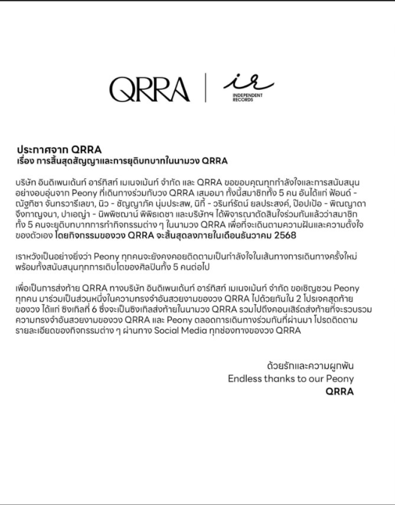 โดยทางต้นสังกัด ได้เผยว่า ประกาศจาก QRRA เรื่อง การสิ้นสุดสัญญาและการยุติบทบาทในนามวง QRRA บริษัท อินดิเพนเด้นท์ อาร์ทิสท์ เมเนจเม้นท์ จํากัด และ QRRA ขอขอบคุณทุกกําลังใจและการสนับสนุน อย่างอบอุ่นจาก Peony ที่เดินทางร่วมกับวง QRRA เสมอมา ทั้งนี้สมาชิกทั้ง 5 คน อันได้แก่ ฟ้อนด์ - ณัฐทิชา จันทรวารีเลขา, นิว - ชัญญาภัค นุ่มประสพ, นิกี้ - วรินท์รัตน์ ยลประสงค์, ป๊อปเป้อ - พิณญาดา จิงกาญจนา, ปาเอญ่า - นิพพิชฌาน์ พิพิธเดชา และบริษัทฯ ได้พิจารณาตัดสินใจร่วมกันแล้วว่าสมาชิก ทั้ง 5 คนจะยุติบทบาทการทํากิจกรรมต่าง ๆ ในนามวง QRRA เพื่อที่จะเดินตามความฝันและความตั้งใจ ของตัวเอง โดยกิจกรรมของวง QRRA จะสิ้นสุดลงภายในเดือนธันวาคม 2568