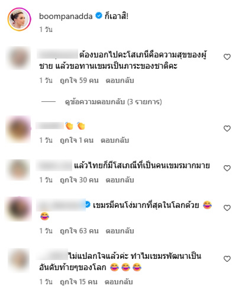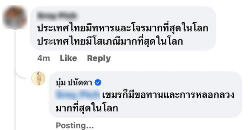 โดย บู่ม ปนัดดา ได้ตอบกลับทันทีว่า เขมรก็มีขอทานและการหลอกลวงมากที่สุดในโลก พร้อมเขียนแคปชั่นว่า ก็เอาสิ ท่ามกลางแฟนๆต่างเข้ามาคอมเมนต์สวนกลับกันอย่างมาก