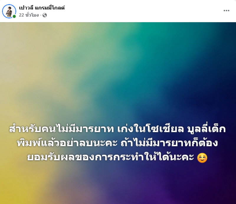 โดยได้ออกมาประกาศผ่านโซเชียลอย่างชัดเจนเลยว่า สำหรับคนไม่มีมารยาท เก่งในโซเชียล บูลลี่เด็ก พิมพ์แล้วอย่าลบนะคะ ถ้าไม่มีมารยาทก็ต้องยอมรับผลของการกระทำให้ได้นะคะ