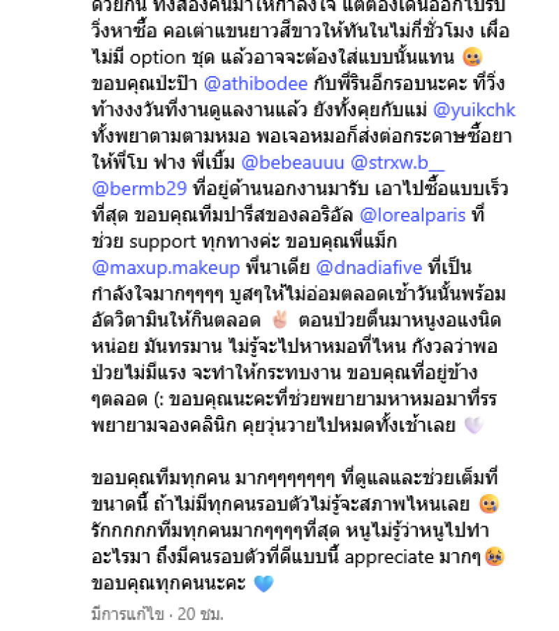 ขอบคุณพี่แม็ก พี่นาเดีย ที่เป็นกำลังใจมากๆๆๆๆ บูสๆให้ไม่อ่อมตลอดเช้าวันนั้นพร้อมอัดวิตามินให้กินตลอด ตอนป่วยตื่นมาหนูงอแงนิดหน่อย มันทรมาน ไม่รู้จะไปหาหมอที่ไหน กังวลว่าพอป่วยไม่มีแรง จะทำให้กระทบงาน ขอบคุณที่อยู่ข้างๆตลอด ขอบคุณนะคะที่ช่วยพยายามหาหมอมาที่รร. พยายามจองคลินิก คุยวุ่นวายไปหมดทั้งเช้าเลย