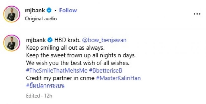 โดยทางด้าน แบงค์ พชร ได้เข้ามาคอมเมนต์อวยพรว่า HBD krab. @bow_benjawan Keep smiling all out as always. Keep the sweet frown up all nights n days. We wish you the best wish of all wishes. #TheSmileThatMeltsMe #BbetteriseB Credit my partner in crime #MasterKalinHan #ยิ้มปลากระเบน ด้าน โบว์ ได้เข้ามาตอบกลับใต้โพสต์ว่า Thank youuuu kaaaaaaab