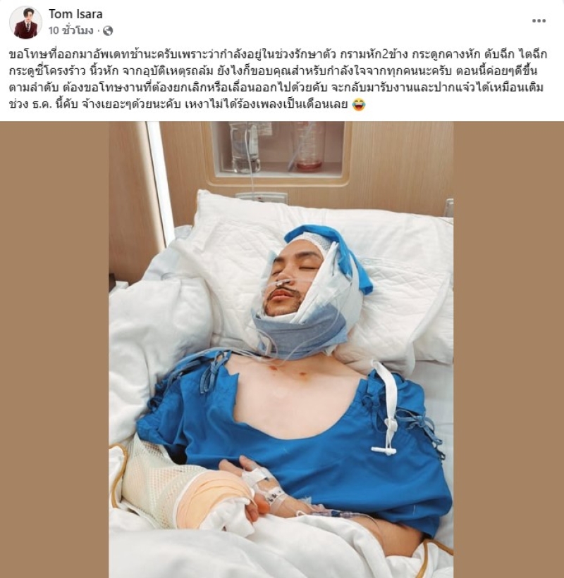 เรียกได้ว่า เป็นนักร้องหนุ่มเสียงดี อย่าง ทอม อิศรา หรือ แฟนๆรู้จักในนาม ทอมรูม 39 ที่ล่าสุด เจ้าตัวออกมาโพสต์ภาพที่ทำเอาแฟนๆใจหายกันเพียบ โดยได้เผยว่า ขอโทษที่ออกมาอัพเดทช้านะครับเพราะว่ากำลังอยู่ในช่วงรักษาตัว กรามหัก2ข้าง กระดูกคางหัก ตับฉีก ไตฉีก กระดูซี่โครงร้าว นิ้วหัก จากอุบัติเหตุรถล้ม