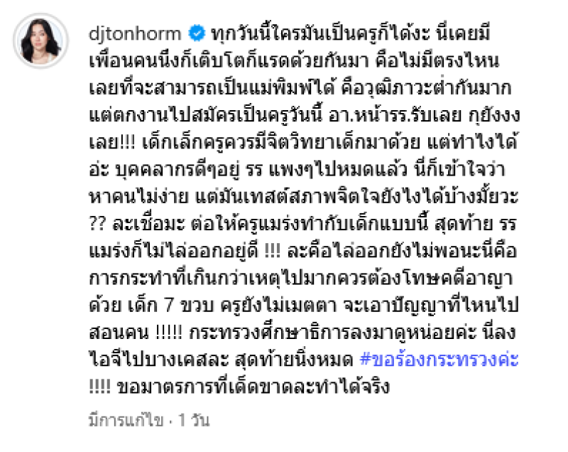 จากกรณีข่าวครูประจำชั้น ป.1 ใช้ฟุตเหล็กฟาดหน้าเด็กนักเรียนวัย 7 ขวบถึง 14 ครั้ง เนื่องจากเด็กหยิบขนมบนโต๊ะครูมากินโดยไม่บอก ซึ่งสาเหตุที่เด็กทำไป เพราะแม่ไม่มีเงินให้ไปโรงเรียน ล่าสุดทางด้านพิธีกรชื่อดังอย่าง ดีเจต้นหอม ได้ออกมาแสดงความคิดเห็นว่า