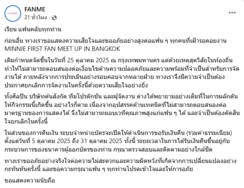 เรียกได้ว่า ทำเอาแฟนๆใจสลายกันเพียบ เมื่ออีกไม่นานก็ถึงงานแฟนมีตของนักร้อง มินนี่ g idle ในประเทศไทย แต่งานกลับถูกยกเลิกกะทันหัน โดยทาง FANME ได้ออกมาเผยว่า เรียน แฟนคลับทุกท่าน ก่อนอื่น ทางเราขอแสดงความเสียใจและขออภัยอย่างสูงต่อแฟน ๆ ทุกคนที่เฝ้ารอคอยงาน MINNIE FIRST FAN MEET UP IN BANGKOK