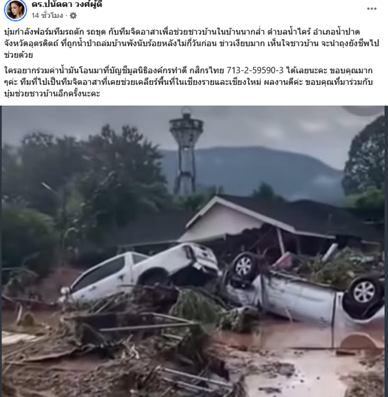 จากเหตุอุทกภัยรุนแรงในเขตจังหวัดอุตรดิตถ์ ที่ อ.น้ำปาด น้ำท่วมหนัก ล่าสุด บุ๋ม ปนัดดา รุดนำทีมงานพร้อมรถขุด เครื่องจักรอื่นๆเข้าช่วยเหลือประชาชน โดยระบุว่า บุ๋มกำลังฟอร์มทีมรถตัก รถขุด กับทีมจิตอาสาเพื่อช่วยชาวบ้านในบ้านนากล่ำ ตำบลน้ำไคร้ อำเภอน้ำปาด จังหวัดอุตรดิตถ์ ที่ถูกน้ำป่าถล่มบ้านพังนับร้อยหลังไม่กี่วันก่อน ข่าวเงียบมาก เห็นใจชาวบ้าน จะนำถุงยังชีพไปช่วยด้วย