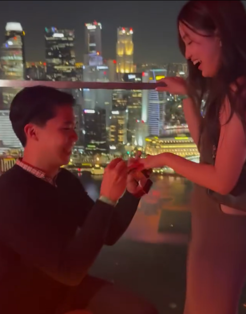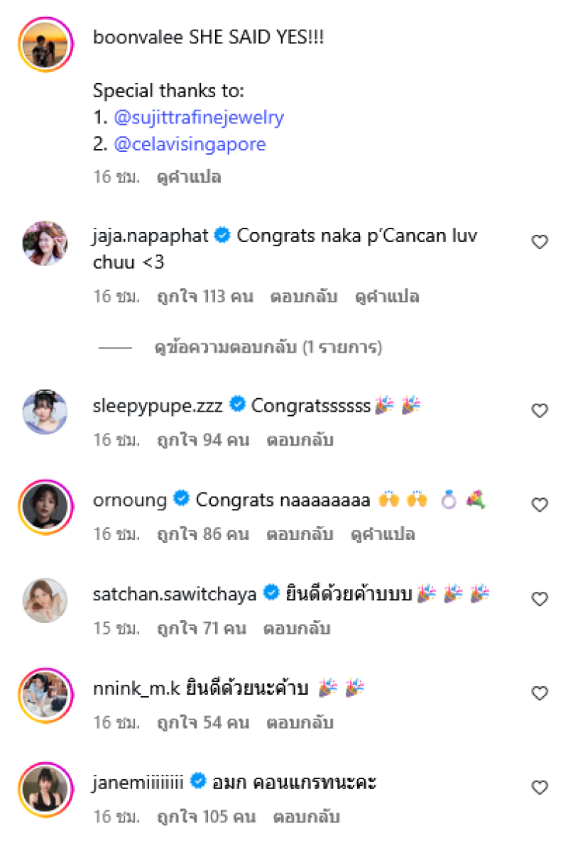 พร้อมเขียนแคปชั่นระบุว่า SHE SAID YES!!! Special thanks to: 1. @sujittrafinejewelry 2. @celavisingapore โดยมีคนในวงการเเละเเฟนๆต่างเข้ามาคอมเมนต์แสดงความยินดีกันอย่างมาก