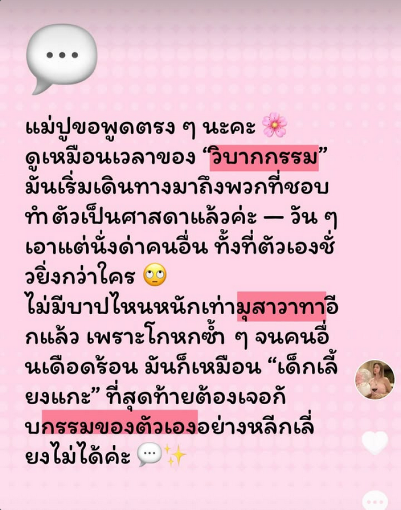 ล่าสุด ปู มัณฑนา ได้ออกมาโพสต์ข้อความผ่านทางอินสตาแกรม ระบุว่า แม่ปูขอพูดตรงๆ นะคะ ดูเหมือนเวลาของ วิบากกรรม มันเริ่มเดินทางมาถึงพวกที่ชอบทำตัวเป็นศาสดาแล้วค่ะ