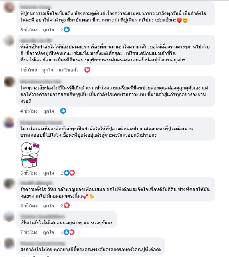 ชีวิตปูมีหลุมหลบภัย เวลาที่เกิดเรื่องไม่สบายใจ ปูจะเข้าไปหลบในนี้ เพราะมีเทวดาสี่องค์ที่รู้เช่นเห็นชาติ รู้กำพืดปู ยืนอยู่เป็นเพื่อน องค์ที่หนึ่ง เป็นกำแพงดันหลัง เพื่อไม่ให้เราเสียหลัก องค์ที่สองและสาม ขนาบซ้ายขวา มีคำพูดเป็นอาวุธ คอยพูดให้เราเห็นคุณค่าในตัว องค์ที่สี่อยู่ด้านหน้า เอาผ้าห่มที่ปักว่า หนูรักแม่ มาคลุมให้