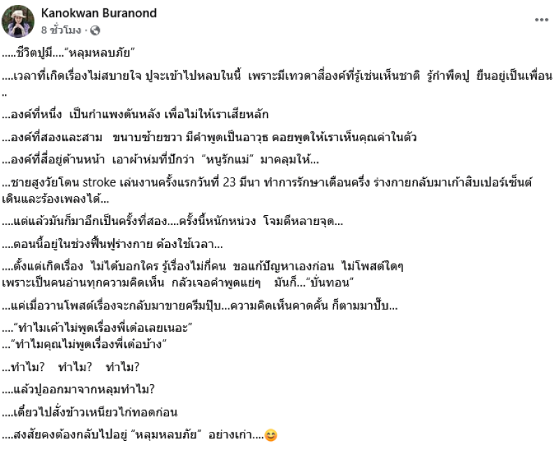 ชายสูงวัยโดน stroke เล่นงานครั้งแรกวันที่ 23 มีนา ทำการรักษาเดือนครึ่ง ร่างกายกลับมาเก้าสิบเปอร์เซ็นต์ เดินและร้องเพลงได้ แต่แล้วมันก็มาอีกเป็นครั้งที่สอง ครั้งนี้หนักหน่วง โจมตีหลายจุด ตอนนี้อยู่ในช่วงฟื้นฟูร่างกาย ต้องใช้เวลา ตั้งแต่เกิดเรื่อง ไม่ได้บอกใคร รู้เรื่องไม่กี่คน ขอแก้ปัญหาเองก่อน ไม่โพสต์ใดๆ เพราะเป็นคนอ่านทุกความคิดเห็น กลัวเจอคำพูดแย่ๆ มันก็ บั่นทอน