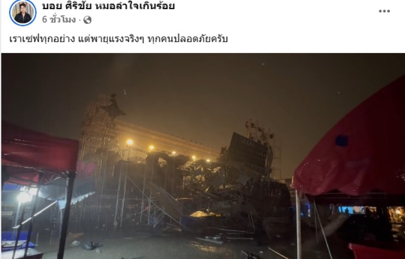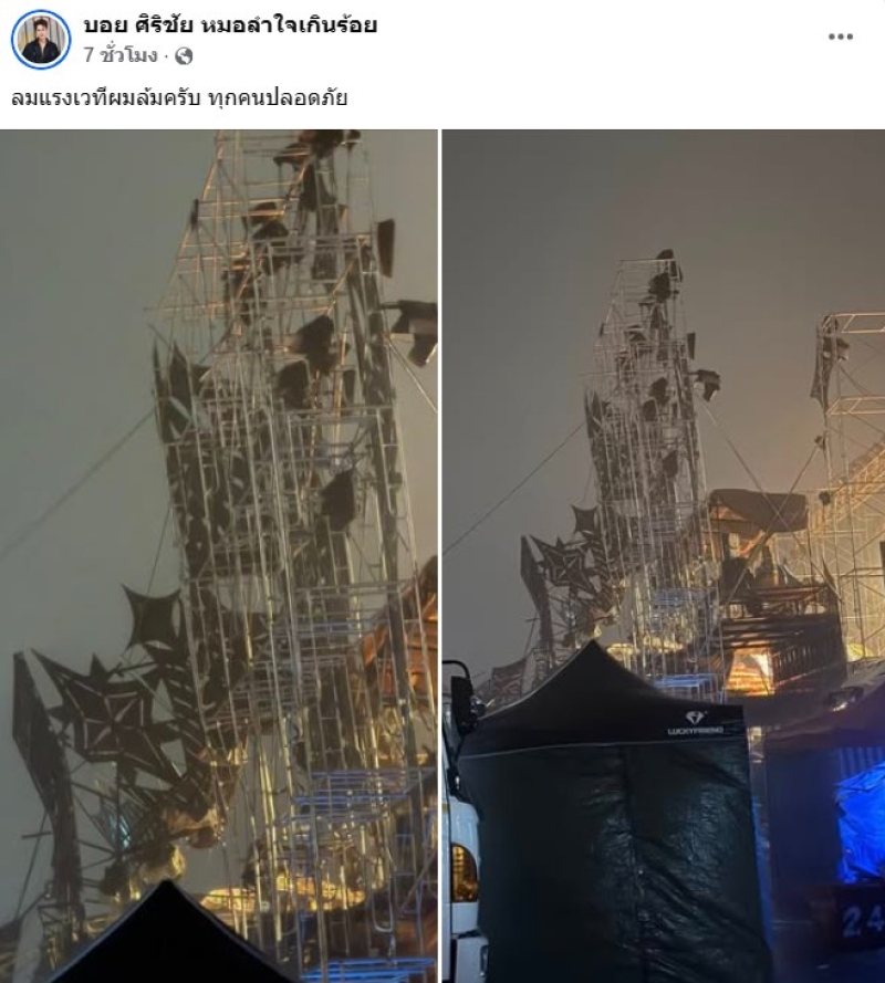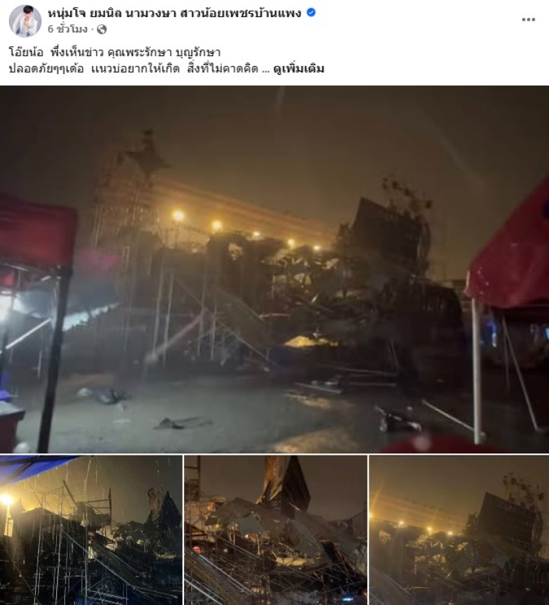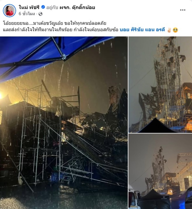 เรียกได้ว่า ทำเอาแฟนๆใจหายกันเพียบ เมื่อทาง บอย ศิริชัย หมอลำใจเกินร้อย สามีของ แอน อรดี ได้ออกมาโพสต์ ว่าเวทีโดนพายุถล่มหนัก ทำเอาเวทีได้รับความเสียหาย โดยทาง บอย ได้ออกมาโพสต์ว่า ลมแรงเวทีผมล้มครับ ทุกคนปลอดภัย และอีกโพสต์ เราเซฟทุกอย่าง แต่พายุแรงจริงๆ ทุกคนปลอดภัยครับ,ทุกคนปลอดภัย สิ่งของพังหาใหม่ได้