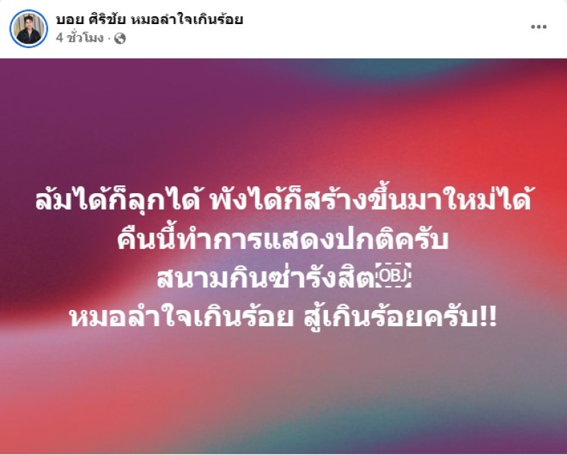 ล่าสุด ได้โพสต์อีกว่า ล้มได้ก็ลุกได้ พังได้ก็สร้างขึ้นมาใหม่ได้ คืนนี้ทำการแสดงปกติครับ สนามกินซ่ารังสิต หมอลำใจเกินร้อย สู้เกินร้อยครับ!