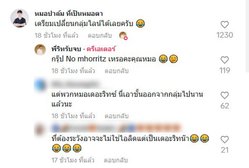 เขาเป็นหมอตากันหมด เราเป็นหมอผิวอยู่คนเดียว เธอว่ามีโอกาสป่ะ แต่ฉันยังเข้ากลุ่มไลน์ได้อยู่นะ ยังส่งตัวเลขให้ฉันอยู่ เพราะทุกวันนี้ที่ส่งมีแต่ค่าใช้จ่าย ยังไม่มีกำไรที่แบ่งกัน ยังไม่มีใครฮุบเนาะ ค่าใช้จ่ายล้วนกำไรยังไม่มี ขณะที่ทาง หมอปาล์ม เข้ามาคอมเมนต์ว่า เตรียมเปลี่ยนกลุ่มไลน์ได้เลยครับ