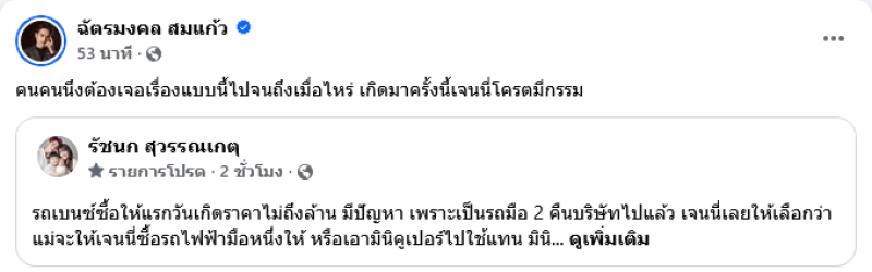 โดยแชร์โพสต์ของ เจนนี่ เรื่องรถเบนซ์ซื้อให้แรกวันเกิดราคาไม่ถึงล้าน มีปัญหา เพราะเป็นรถมือ 2 คืนบริษัทไปแล้ว หลังจากแม่เอาไปจำนำ 2 ครั้ง เจนนี่ไถ่กลับมา 2 ครั้ง และเห็นว่าครั้งนี้แกไม่มีรถเลยให้กลับไปใช้อีกรอบเพราะอยากให้แม่มีรถขับ แต่ที่ไม่โอนเป็นชื่อแม่เพราะกลัวเหตุการณ์เดิมๆจะเกิดขึ้น โดยยิวระบุว่า คนคนนึงต้องเจอเรื่องแบบนี้ไปจนถึงเมื่อไหร่ เกิดมาครั้งนี้เจนนี่โครตมีกรรม