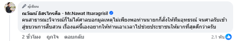 คนสาธารณะวิจารณ์ก็ไม่ได้ศาลบอกมูลเหตุไม่เพียงพอท่านนายกก็สั่งให้ทีมอุทธรณ์ จนศาลรับเข้าสู่ขบวนการสืบสวน เรื่องแค่นี้เองอยากให้ท่านเอาเวลาไปช่วยประชาชนให้มากที่สุดดีกว่าครับ ท่ามกลางชาวเน็ตต่างเข้ามาคอมเมนต์กันอย่างมาก