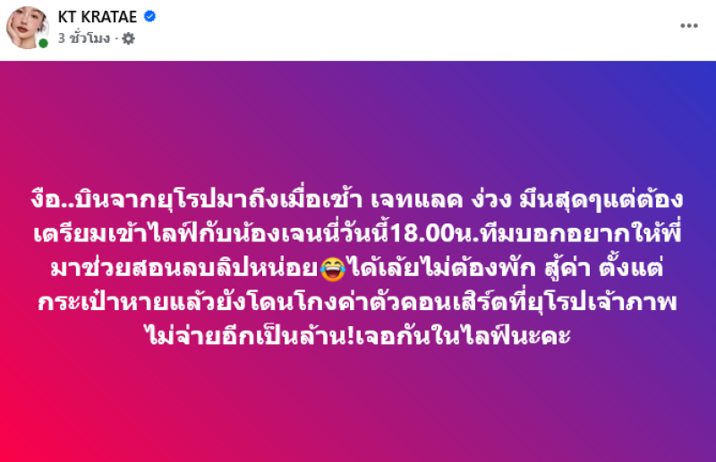 ทีมบอกอยากให้พี่มาช่วยสอนลบลิปหน่อย ได้เล้ยไม่ต้องพัก สู้ค่า ตั้งแต่กระเป๋าหายแล้วยังโดนโกงค่าตัวคอนเสิร์ตที่ยุโรปเจ้าภาพไม่จ่ายอีกเป็นล้าน!เจอกันในไลฟ์นะคะ ร่างยังโงนเงนอยู่ เนื่องจากไปยุโรป 3 อาทิตย์ มึนเวลา แต่หน้าที่ต้องมาก่อน #กระเป๋าแอร์เมสหาย แล้วยัง #โดนโกงค่าตัวคอนเสิร์ตที่ยุโรป เจ้าภาพไม่จ่ายอีกเป็นล้าน! เอ้ออออ!! #ขอไปเล่าในไลฟ์นะคะ
