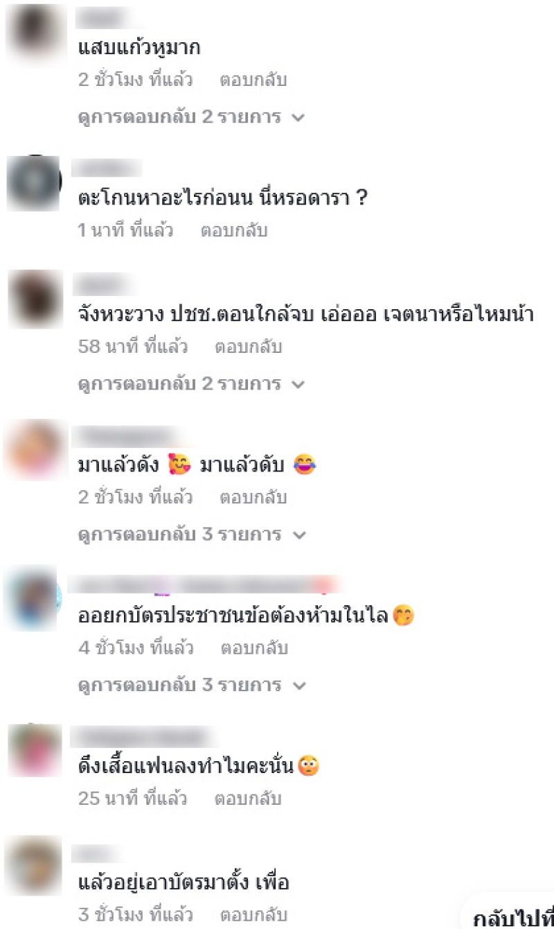 โดยมีชาวเน็ตต่างเข้ามาคอมเมนต์กันอย่างมาก อาทิ ปุ๊กลู๊กดูพูดเยอะไป,แสบแก้วหูมาก,จังหวะวาง ปชช.ตอนใกล้จบ เอ่อออ เจตนาหรือไหมน้า,ออยกบัตรประชาชนข้อต้องห้ามในไล,ดึงเสื้อแฟนลงทำไมคะนั่นตะโกนหาอะไรก่อนน นี่หรอดารา เป็นต้น