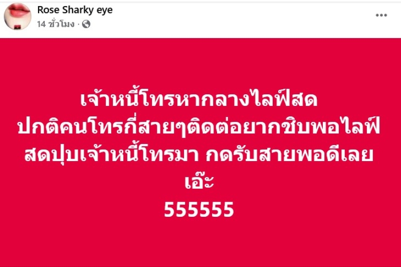 เรียกได้ว่า กลายเป็นดราม่าอีกแล้ว เมื่อล่าสุดได้มีเพจดัง อย่าง Rose Sharky eye ออกมาโพสต์ว่า เจ้าหนี้โทรหากลางไลฟ์สด ปกติคนโทรกี่สายๆติดต่อยากชิบพอไลฟ์สดปุบเจ้าหนี้โทรมา กดรับสายพอดีเลยเอ๊ะ 555555