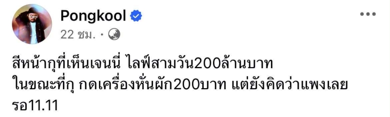 โดย มีข้อความว่า สีหน้าผมตอนเห็นเจนนี่ ไลฟ์สามวัน 200 ล้าน ในขณะที่ผมหั่นผัก 200 บาท แต่ยังคิดว่าแพงเลย รอ 11.11
