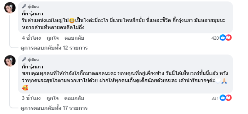 ขอผลบุญของการอโหสิกรรมในครั้งนี้ ส่งผลให้กิ๊ก ลูกชาย และครอบครัว พบเจอแต่สิ่งดีๆ คนดีๆ เรื่องดีๆนับจากนี้เป็นต้นไป ใครจะเริ่มต้นมีครอบครัวใหม่ในรูปแบบไหนขอให้ขึ้นอยู่ที่บุญกรรมที่สร้างมาด้วยกัน ส่วนตัวเราขออยู่เป็นโสด สดใสแบบนี้ไปนานๆ ยาวๆ ไม่ต้องคอยระแวงหรือระวังอะไร ลูกคือสิ่งสำคัญ เลี้ยงลูกให้ได้ดี มีกำลังกาย กำลังใจในการทำงานและสู้กับอุปสรรค ได้ใช้ชีวิตอิสระในแบบที่อยากเป็น ขอยืนยันเหมือนเดิมเสมอ เราเจอกันได้ คุยกันได้ เจอลูกได้ ช่วยเหลือกันได้และสิ่งที่ทำได้คือเราเป็นเพื่อนที่ดีต่อกันได้ เราต้องแยกแยะและรีบแยกย้ายกันไปสร้างอนาคตที่ดี ใครได้ดีก่อนกันเราจะกลับมาช่วยกัน ยินดี ดีใจ และอวยพรกิ๊กและลูกด้วยนะคะ
