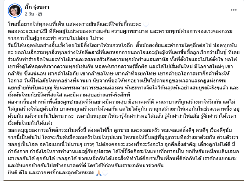 โพสนี้อยากให้ทุกคนที่เห็น เเสดงความยินดีและดีใจกับกิ๊กนะคะ ตลอดระยะเวลา2ปี ที่ติดอยู่ในบ่วงของความแค้น ความผูกพยาบาท และความทุกข์ด้วยการจองเวรจองกรรม จากการเป็นผู้ถูกกระทำ ความไม่ปล่อย ไม่วาง วันนี้ได้หลุดพ้นอย่างสิ้นเชิงโดยไม่มีสิ่งใดมาให้รบกวนใจอีก สิ้นข้อสงสัยและคำถามใดๆอีกต่อไป ปลดทุกพันธะ