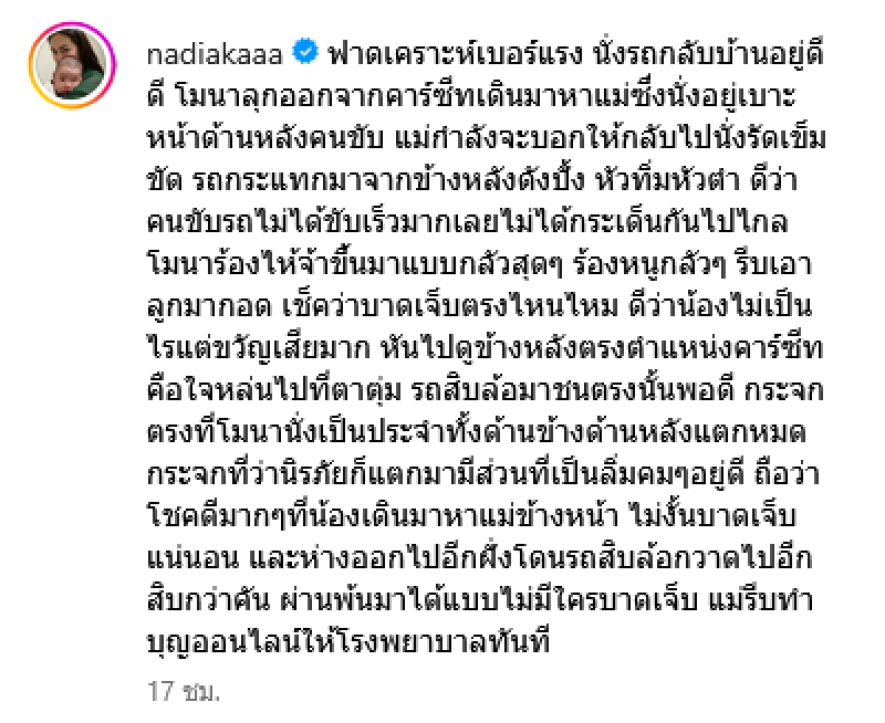 แม่กำลังจะบอกให้กลับไปนั่งรัดเข็มขัด รถกระแทกมาจากข้างหลังดังปั้ง หัวทิ่มหัวตำ ดีว่าคนขับรถไม่ได้ขับเร็วมากเลยไม่ได้กระเด็นกันไปไกล โมนาร้องไห้จ้าขึ้นมาแบบกลัวสุดๆ ร้องหนูกลัวๆ รีบเอาลูกมากอด เช็คว่าบาดเจ็บตรงไหนไหม ดีว่าน้องไม่เป็นไรแต่ขวัญเสียมาก หันไปดูข้างหลังตรงตำแหน่งคาร์ซีทคือใจหล่นไปที่ตาตุ่ม รถสิบล้อมาชนตรงนั้นพอดี