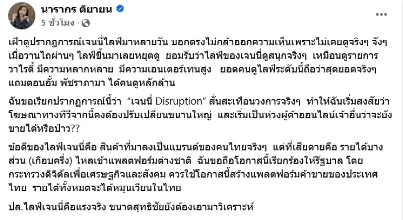 ข้อดีของไลฟ์เจนนี่คือ สินค้าที่มาลงเป็นแบรนด์ของคนไทยจริงๆ แต่ที่เสียดายคือ รายได้บางส่วน (เกือบครึ่ง) ไหลเข้าแพลตฟอร์มต่างชาติ ฉันขอถือโอกาสนี้เรียกร้องให้รัฐบาล โดยกระทรวงดิจิตัลเพื่อเศรษฐกิจและสังคม ควรใช้โอกาสนี้สร้างแพลตฟอร์มค้าขายของประเทศไทย รายได้ทั้งหมดจะได้หมุนเวียนในไทย