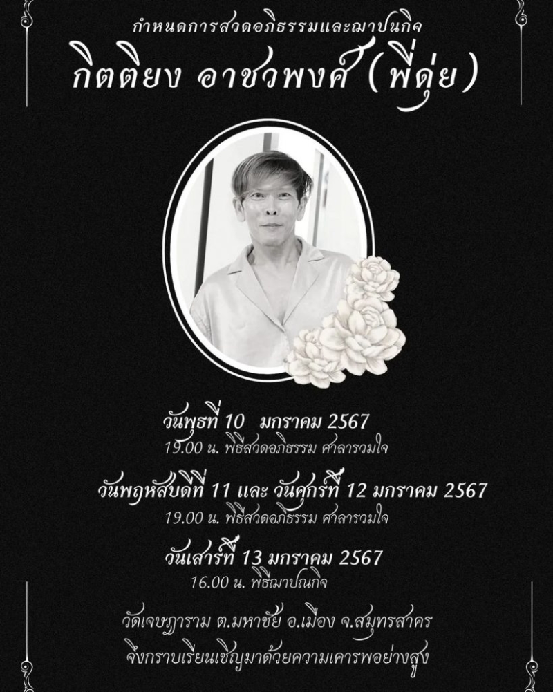 ทั้งนี้สอบถามจากคนสนิทของ พี่ดุ่ย ทราบว่าเขาออกกำลังกายตอนเช้าแล้วก็ล้มหมดสติไป ขอแสดงความอาลัยอย่างยิ่ง