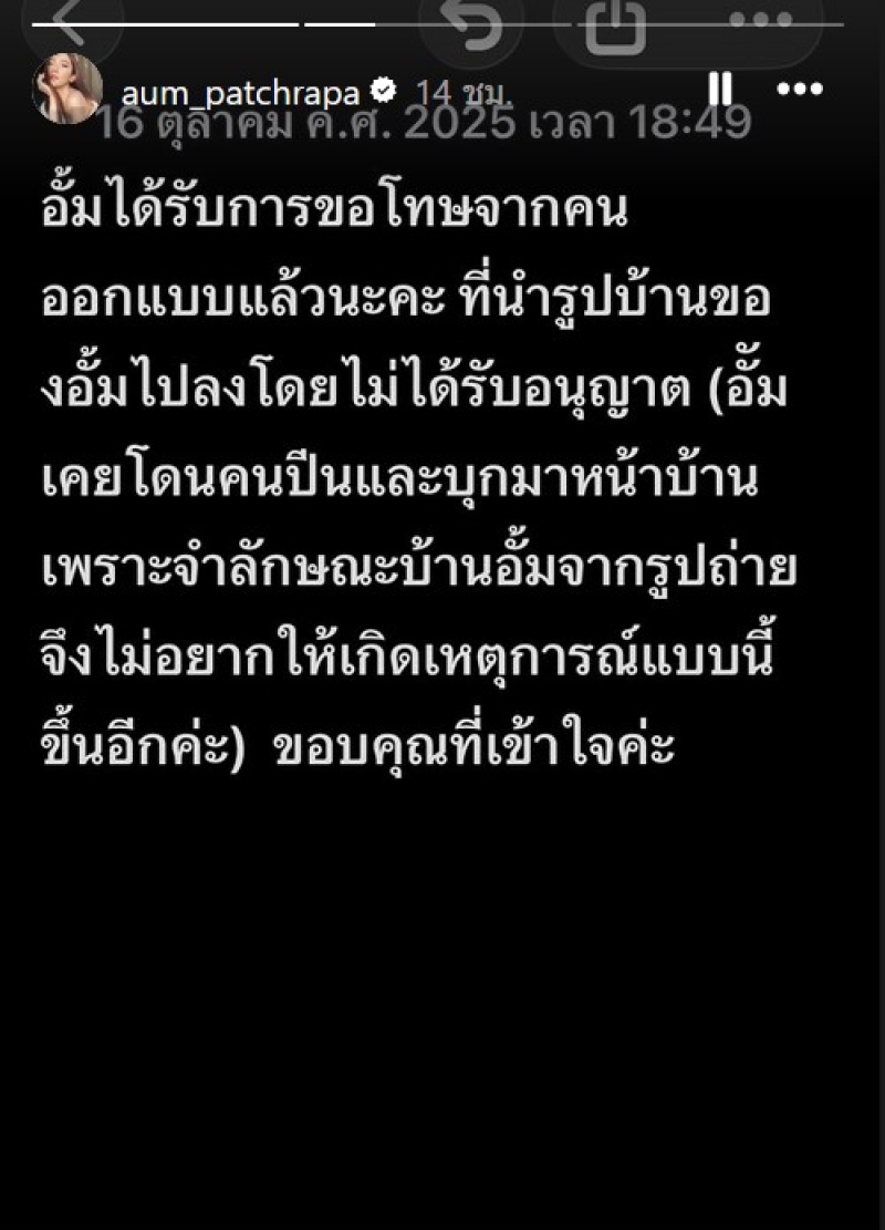 จากกรณีที่ก่อนหน้านั้น ทางนางเอกตัวท็อป อย่าง อั้ม พัชราภา ออกมาโพสต์ว่า ไม่โอเค คุณไม่มีสิทธิ์เอารูปบ้านคนอื่นมาลง ช่วยลงขอโทษและทิ้งโพสต์ขอโทษ 2 อาทิตย์ และลบรูปออกทันที และ และอีหนึ่งสตอรี่ ก็ได้โพสต์ว่า หมายถึง(ต้นโพสต์)ที่ต้องลบ ส่วนคนอื่นๆเพจอื่น อั้มเข้าใจว่าไปเห็นรูปมาก็เลยเอามาลงต่อๆ ก็เข้าใจง่าย