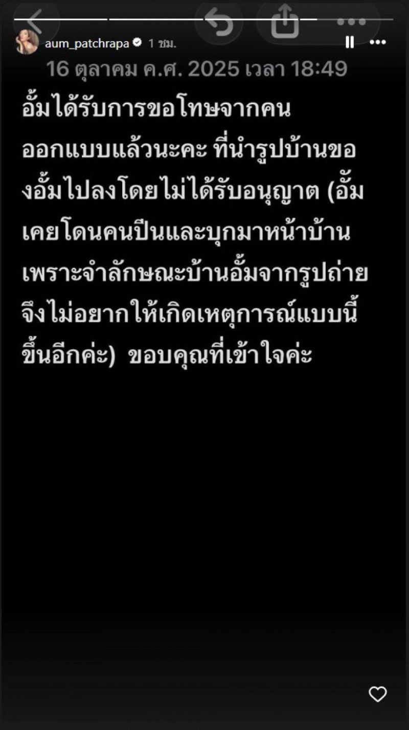 ล่าสุด อั้ม ได้ออกมามาอัปเดตว่า อั้มได้รับการขอโทษจากคนออกแบบแล้วนะคะ ที่นำรูปบ้านของอั้มไปลงโดยไม่ได้รับอนุญาต (อั้มเคยโดนคนปีนและบุกมาหน้าบ้าน เพราะจำลักษณะบ้านอั้มจากรูปถ่าย จึงไม่อยากให้เกิดเหตุการณ์แบบนี้ ขึ้นอีกค่ะ) ขอบคุณที่เข้าใจค่ะ