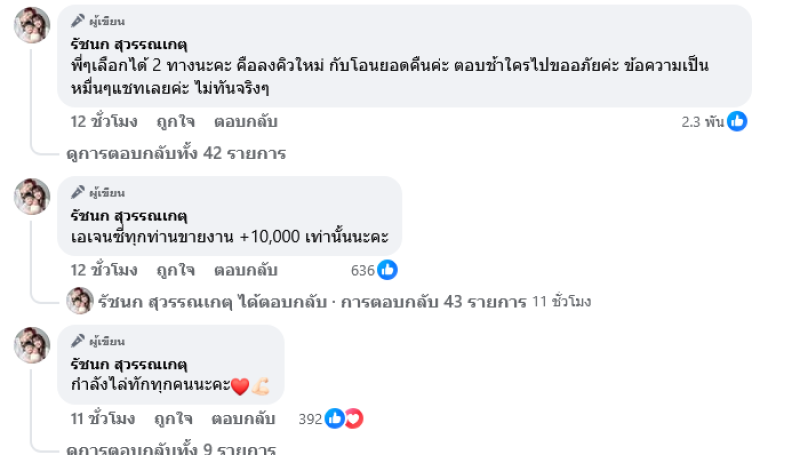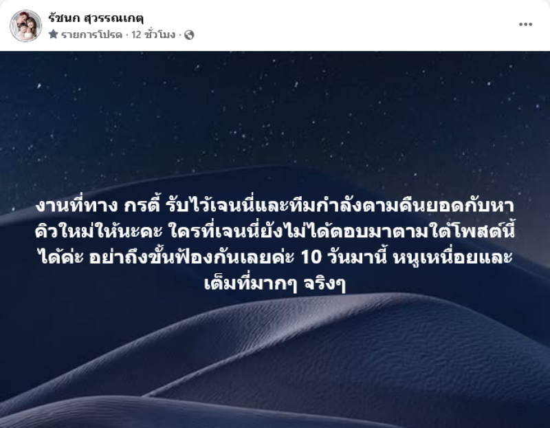 ต่อมาเจนนี่ ได้ออกมาโพสต์เคลียร์ว่า งานที่ทาง กรตี้ รับไว้เจนนี่และทีมกำลังตามคืนยอดกับหาคิวใหม่ให้นะคะ ใครที่เจนนี่ยังไม่ได้ตอบมาตามใต้โพสต์นี้ได้ค่ะ อย่าถึงขั้นฟ้องกันเลยค่ะ 10 วันมานี้ หนูเหนื่อยและเต็มที่มากๆ จริงๆ