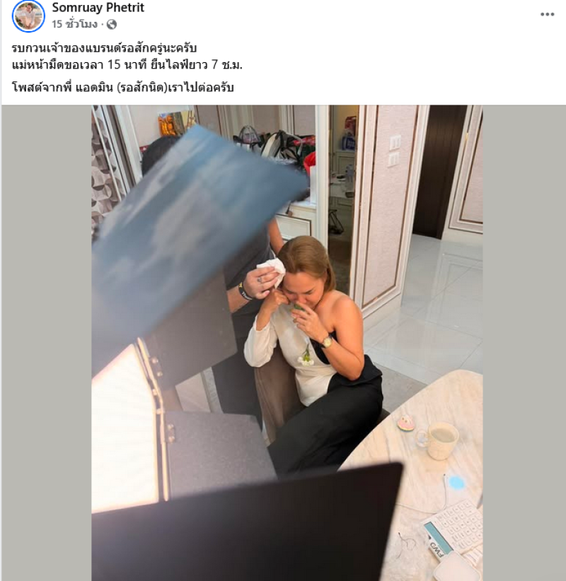 พร้อมเขียนข้อความระบุว่า รบกวนเจ้าของแบรนด์รอสักครู่นะครับ แม่หน้ามืดขอเวลา 15 นาที ยืนไลฟ์ยาว 7 ช.ม. โพสต์จากพี่ แอดมิน (รอสักนิด)เราไปต่อครับ ท่ามกลางแฟนๆต่างเข้ามาคอมเมนต์ส่งกำลังใจให้ไม่น้อย