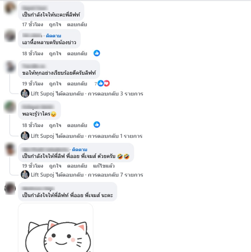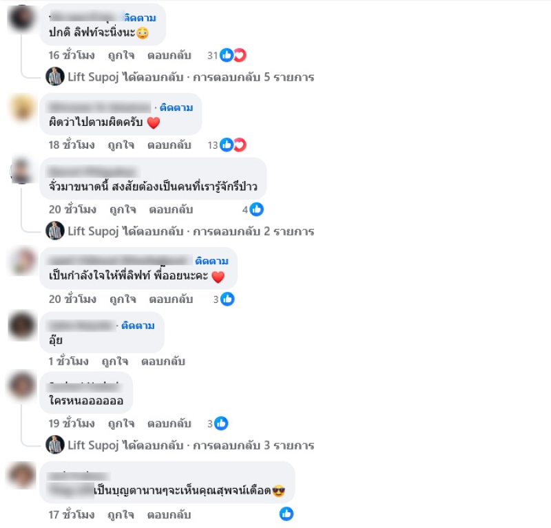 โดยมีหลายคนต่างเข้ามาคอมเมนต์ว่า ปกติ ลิฟท์จะนิ่งนะ,จั่วมาขนาดนี้ สงสัยต้องเป็นคนที่เรารู้จักรึป่าว,เป็นกำลังใจให้พี่ลิฟท์ พี่ออยนะคะ ,ให้กำลังใจพี่ลิฟท์นะคะ,เป็นกำลังใจให้นะคะคุณลิฟท์,ขอให้ทุกอย่างเรียบร้อยดีครับลิฟท์,พอจะรู้ว่าใคร