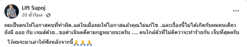 ทำเอาแฟนๆแห่เตรียมรอใส่ใจไม่น้อยเมื่อล่าสุดนักร้องเเละนักแสดงดัง ลิฟท์ สุพจน์ ได้ออกมาโพสต์ข้อความโดนคนใกล้ตัวทำร้ายว่า ผมเป็นคนให้โอกาสคนที่ทำผิด แต่ในเมื่อผมให้โอกาสแล้วคุณไม่แก้ไข และเรื่องนี้ไม่ได้เกิดกับผมคนเดียว ยังมี ออย กับ เจมส์ด้วย ขอดำเนินคดีตามกฎหมายนะครับ คนใกล้ตัวที่ไม่คิดว่าจะทำร้ายกัน เจ็บที่สุดครับ ไว้ผมจะมาเล่าให้ฟังหลังจากนี้